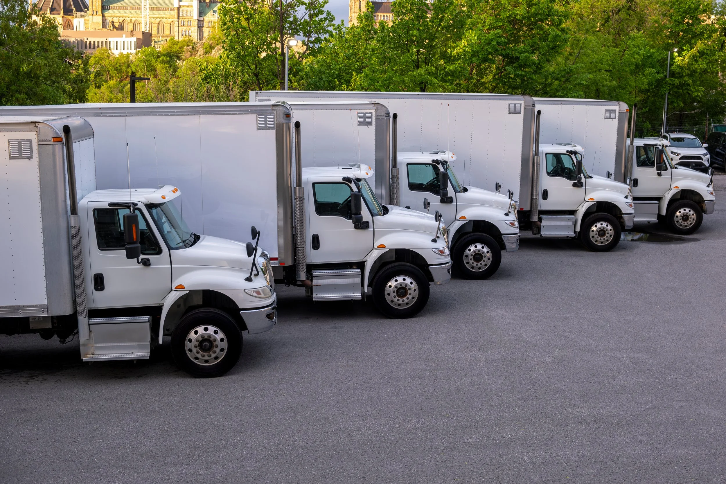 Row of white delivery trucks parked in a lot, surrounded by trees and a building in the background.